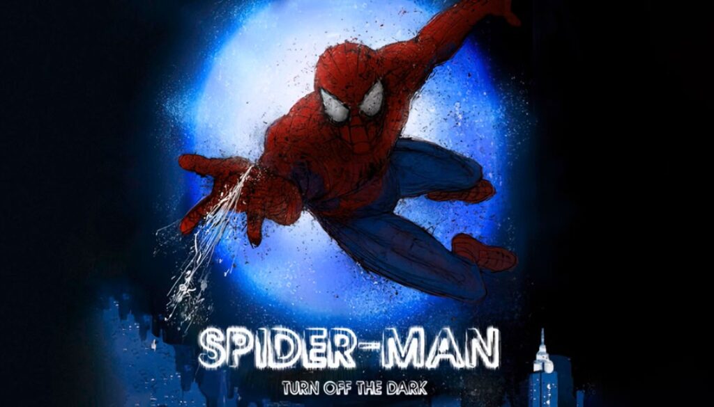 Spider-Man: Turn Off the Dark is a musical with music and lyrics by Bono and the Edge of Irish rock band U2 and a book by Julie Taymor, Glen Berger, and Roberto Aguirre-Sacasa. Based on the Marvel Comics character Spider-Man, the story incorporates elements of the 2002 film Spider-Man, the 2004 film Spider-Man 2 and the Greek myth of Arachne. It tells Spider-Man’s origin story, his romance with Mary Jane Watson, and his battles with the Green Goblin. It includes highly technical stunts, such as aerial combat scenes and actors swinging from “webs”.